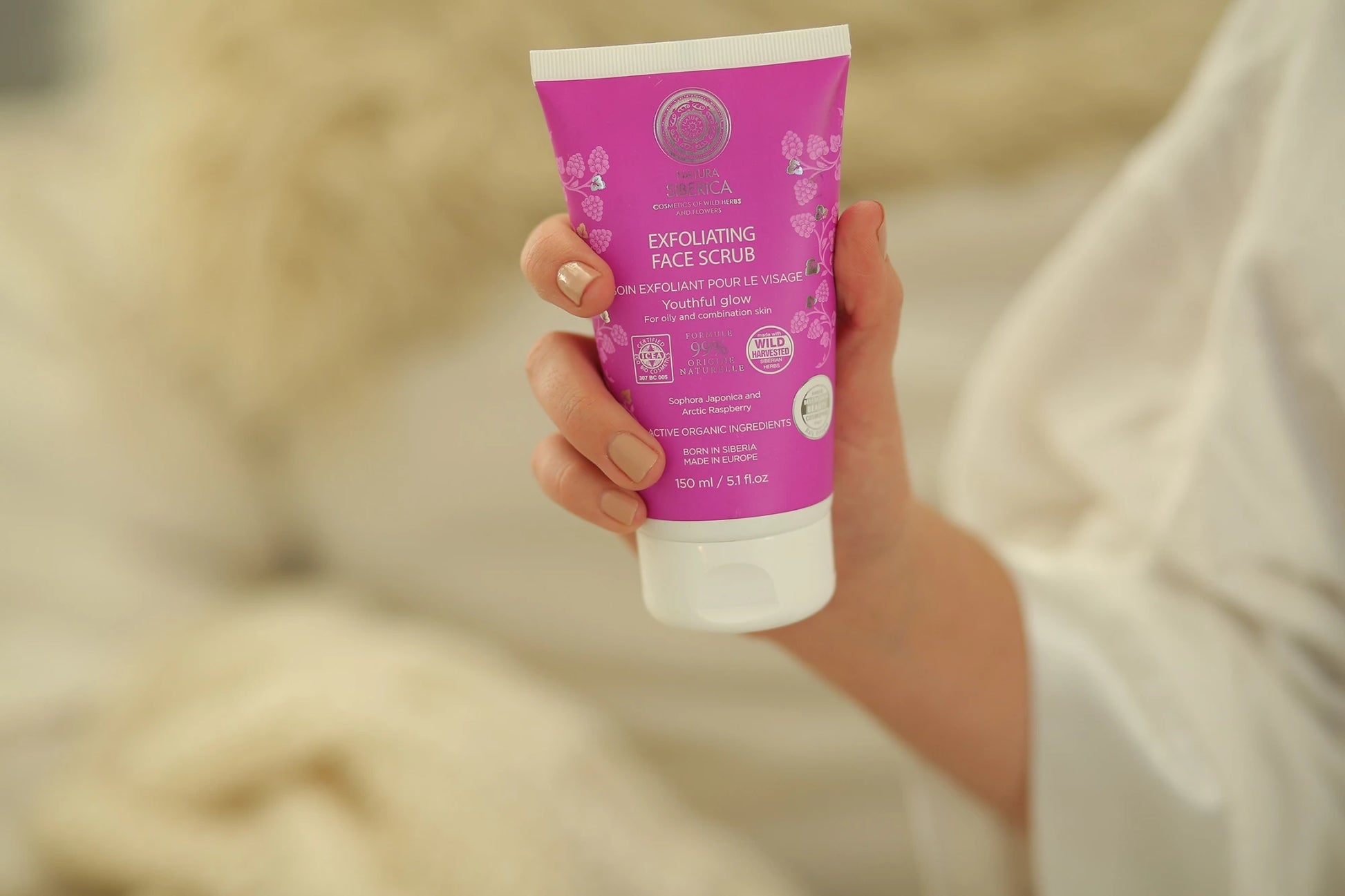 - Las semillas de Damasco exfolian la piel con suavidad mientras el extracto de Frambuesa Ártica la alivia.